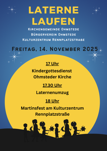Die Kirchengemeinde Ohmstede, der Bürgerverein Ohmstede und das Kulturzentrum Rennplatz laden ein zum Laternelaufen.