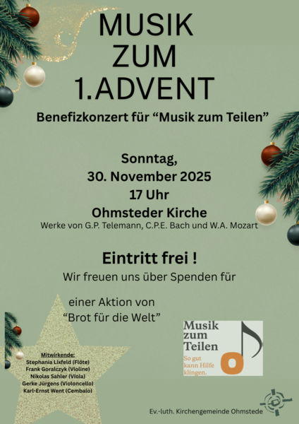 Wie (fast) in jedem Jahr wird die Adventszeit in Ohmstede wieder mit einem Benefizkonzert für „Brot für die Welt“ begonnen. Zum 11. Mal laden Musiker*innen des Oldenburgischen Staatsorchesters gemeinsam mit dem Oldenburger Cembalisten Karl-Ernst Went herzlich zu einem Konzert am 1. Advent um 17 Uhr in die Ohmsteder Kirche ein. Zu hören sein werden Werke von Johann Sebastian Bach, Carl Philipp Emanuel Bach, Georg Philipp Telemann und Wolfgang Amadeus Mozart.