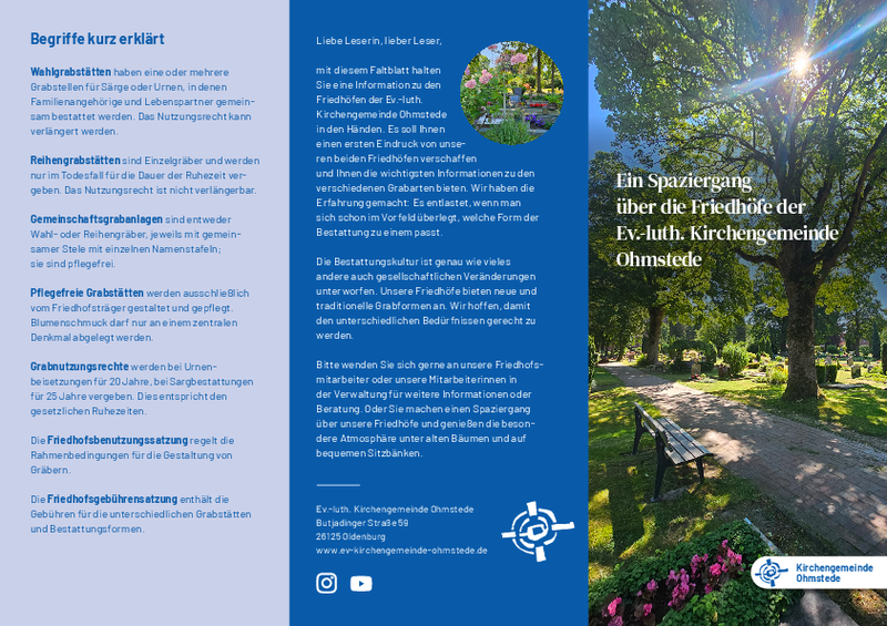 Für die Friedhöfe Donnerschwee und Ohmstede gibt es einen neuen Flyer mit Infos über die neuen Grabarten. Den Flyer erhalten Sie im Kirchenbüro oder im Info-Kasten auf den Friedhöfen.